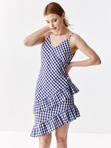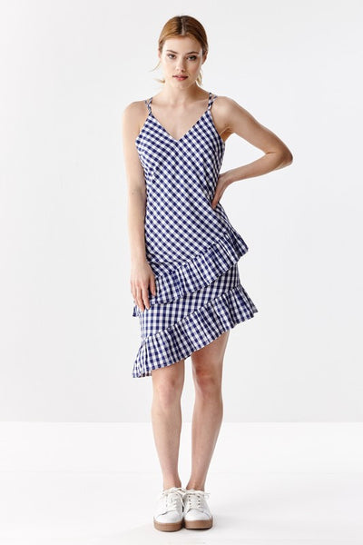 This classic soft pattern is timeless! The asymmetrical style gives it an edgy and feminine look. Sleeveless dress featuring ruffles on hem and a criss-cross back. Asymmetrical cut above the knee length. Concealed zipper on back. Lined. Wear it all year long with sandals, flatforms or heels.
